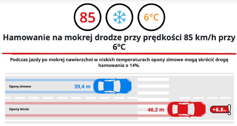 Różnica w drodze hamowanie to 7 metrów na korzyść opon zimowych. To są prawie 2 długości małego SUVa! Zaryzykujcie jazdę na oponach letnich z rodziną lub przyjaciółmi?